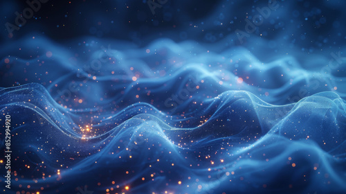 Wall mural smooth smoke particle wave, big data techno background with glowing dots, hi-tech concept, blue colo