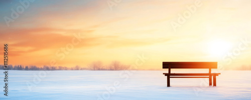 The watermark will not be included on Wall mural.: Snow-covered field with an empty bench basking in the warm glow of the setting sun, creating a tranq