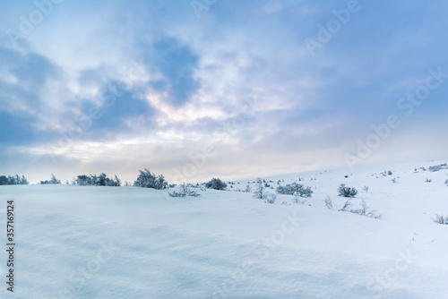 Wall mural : Snow covered winter arctic tundra landscape of unspoiled nature with scattered trees with plenty of
