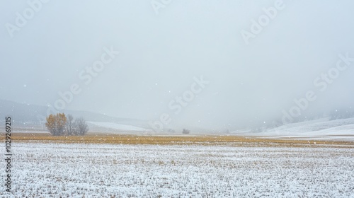 Wall mural snow gently falling on an open field, with distant mountains barely visible through the mist - Wall murals Wall mural snow gently falling on an open field, with distant mountains barely visible through the mist - Wall murals
