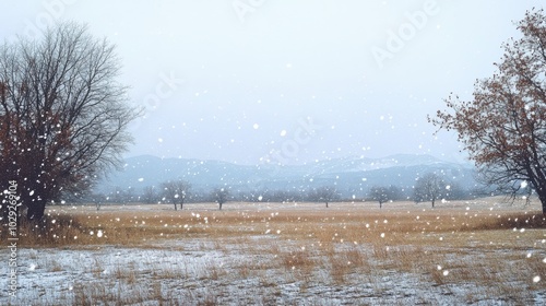 The watermark will not be included on Wall mural.: Snow gently falling on an open field, with distant mountains barely visible through the mist