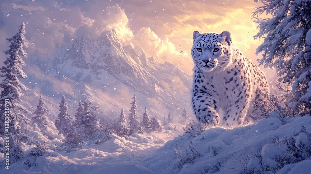Snow leopard resting in a high altitude snowy landscape with its powerful predator eyes and thick fuWall mural