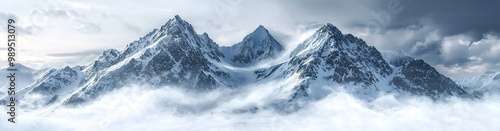 Snowy mountains surrounded by clouds, with a white background and sharp - - - Wall mural
