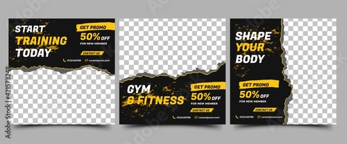 Wall mural social media post template design set for gym and fitness. black background with abstract yellow sha
