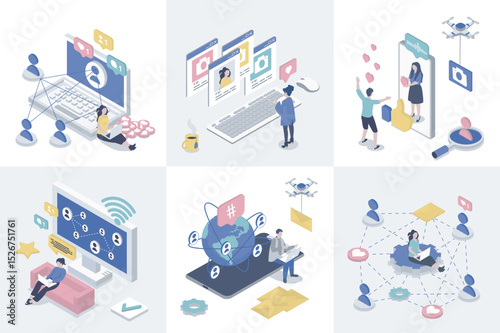 Wall mural social network 3d isometry concept for web design. collection set with isometric people connecting a