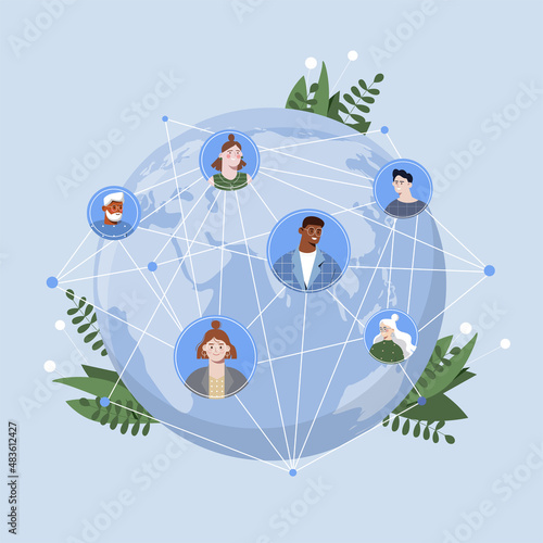 Wall mural : Social network concept - avatars of characters connected by network on globe - modern technologies and
