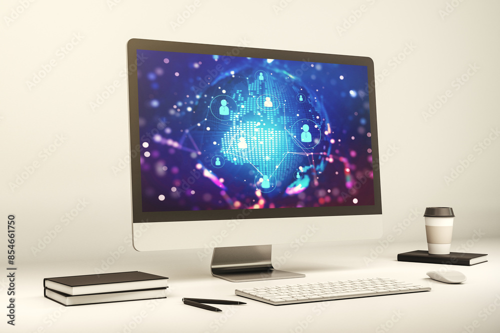 Wall mural social network media concept with world map on modern computer monitor. 3d rendering - Wall murals Wall mural social network media concept with world map on modern computer monitor. 3d rendering - Wall murals