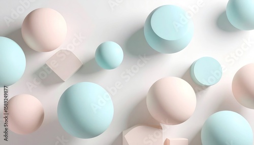 The watermark will not be included on Wall mural.: Soft pastel 3d shapes floating against a white background with subtle shadows showing geometric comp