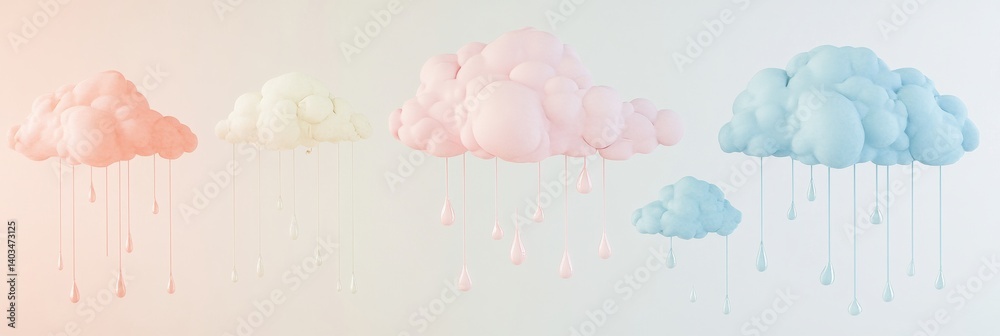Wall mural : Soft pastel clouds with gentle raindrops on a neutral background create a serene and calming atmosph