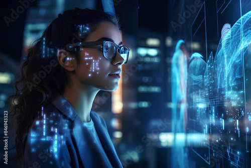 Wall mural software, coding hologram and woman on tablet thinking of data analytics, digital technology and nig - Wall murals Wall mural software, coding hologram and woman on tablet thinking of data analytics, digital technology and nig - Wall murals