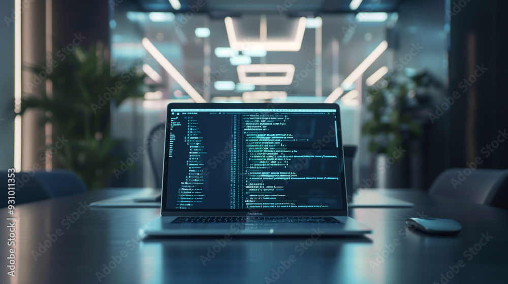 Wall mural software codes display on screen of a laptop on the table in modern office, web development software
