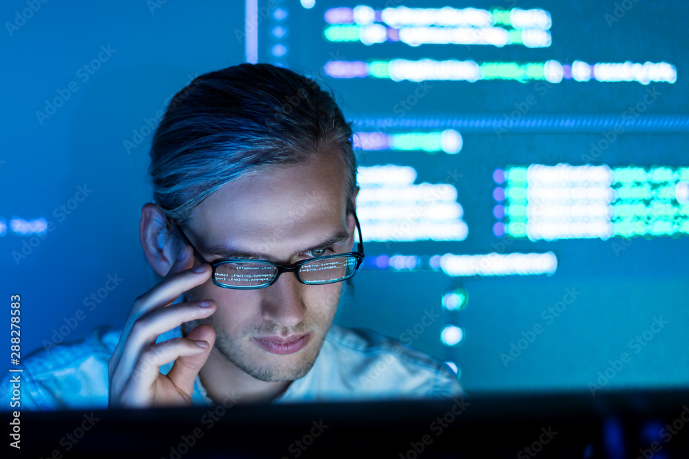 The watermark will not be included on Wall mural.: Software developer freelancer in glass work with program code c++, java, javascript on wide displays