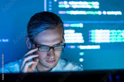 Wall mural software developer freelancer in glass work with program code c++, java, javascript on wide displays