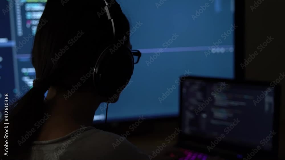 The watermark will not be included on Wall mural.: Software developer freelancer woman female in glasses work with program code c ++, java, javascript