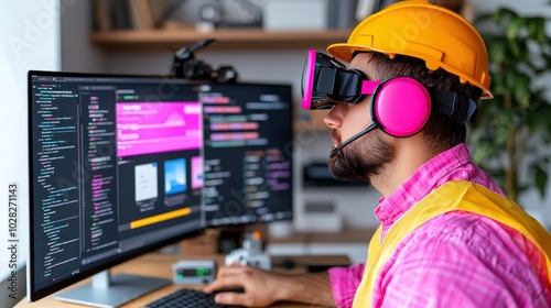 The watermark will not be included on Wall mural.: Software developer in vr headset working on code at desk
