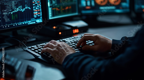The watermark will not be included on Wall mural.: Software developer programming and coding on computer keyboard in dark room at night