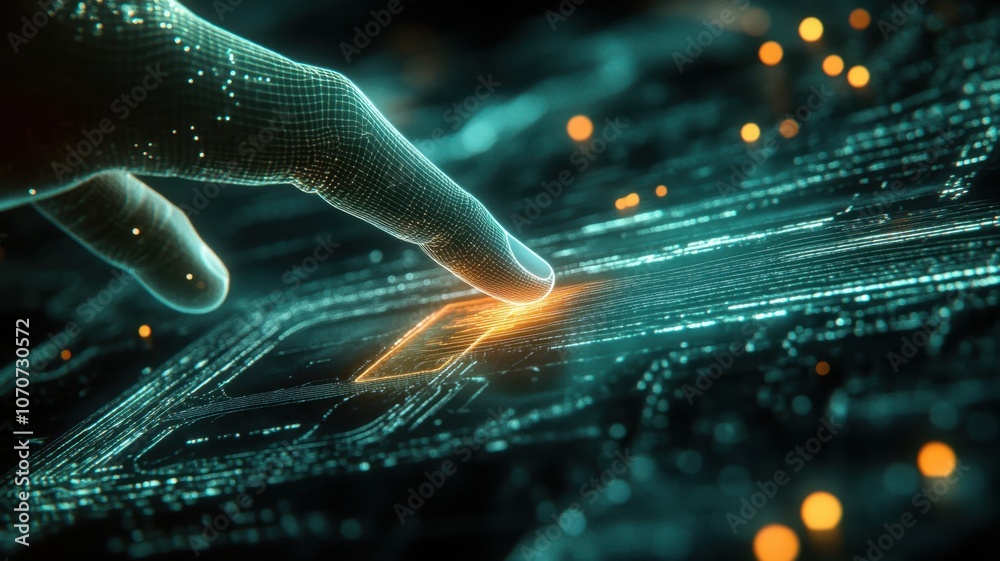 Wall mural : Software developer touching digital futuristic holographic interface background with finger