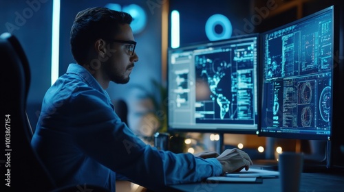 Wall mural software developer working on computer with multiple monitors showing interface with graphics and co - Wall murals Wall mural software developer working on computer with multiple monitors showing interface with graphics and co - Wall murals