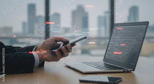 The watermark will not be included on Wall mural.: Software developer working with code on laptop and mobile phone