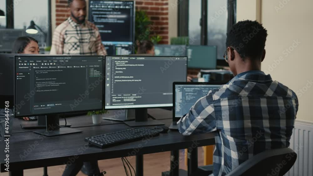 Wall mural : Software developer writing code on laptop and computer keyboard looking at multiple screens with pro