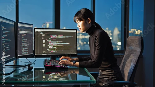 Wall mural : Software developer writing code on laptop and computer keyboard looking at multiple screens - motion