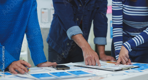The watermark will not be included on Wall mural.: Software developers collaborating around a table, pointing at a mobile app design sketch, while anal