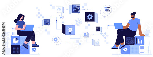 The watermark will not be included on Wall mural.: Software developers freelancers working on web and application development on laptop smm manager, pr