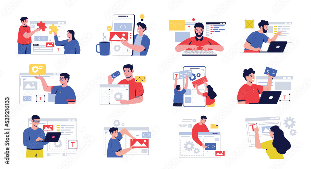 Wall mural software development characters. people working on front-end and back-end web program, mobile applic - Wall murals Wall mural software development characters. people working on front-end and back-end web program, mobile applic - Wall murals