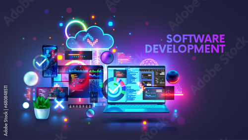 Wall mural : Software development coding process concept - programming, testing cross platform code, app on laptop