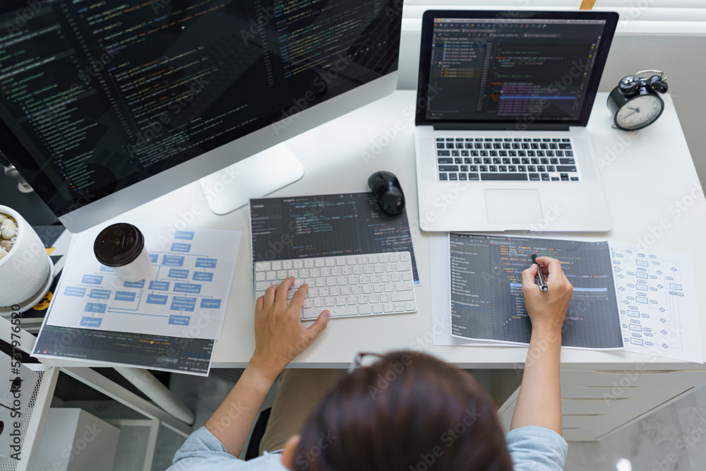 The watermark will not be included on Wall mural.: Software development concept, male programmer pointing on data code to checking website programming