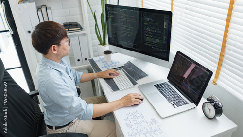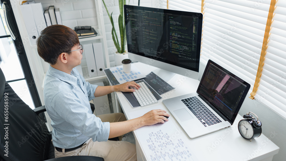 Wall mural software development concept, male programmer typing data code on laptop to develop app and website
