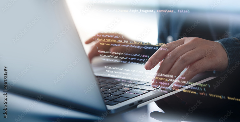 Wall mural software development concept. coding programmer, software engineer working on laptop with javascript