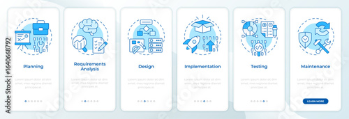 Software development life cycle blue onboarding mobile app screen - walkthrough 6 steps editable grapWall mural