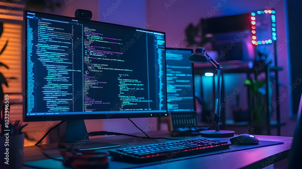 The watermark will not be included on Wall mural.: Software development workspace with code on screen highlighting creativity and problem-solving
