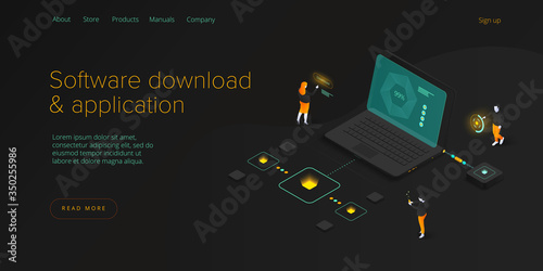 Wall mural : Software download and application isometric vector illustration - programmers and engeneers working o