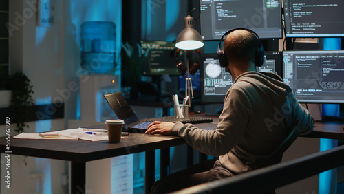 The watermark will not be included on Wall mural.: Software engineer typing programming code on laptop with multiple monitors, working with html script