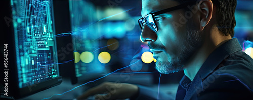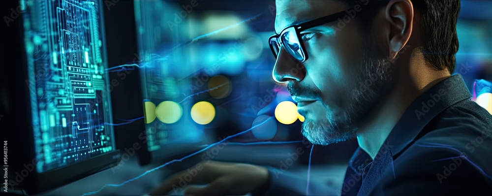 Wall mural software engineer working on ai techology. works on desktop computer in college. - Wall murals Wall mural software engineer working on ai techology. works on desktop computer in college. - Wall murals