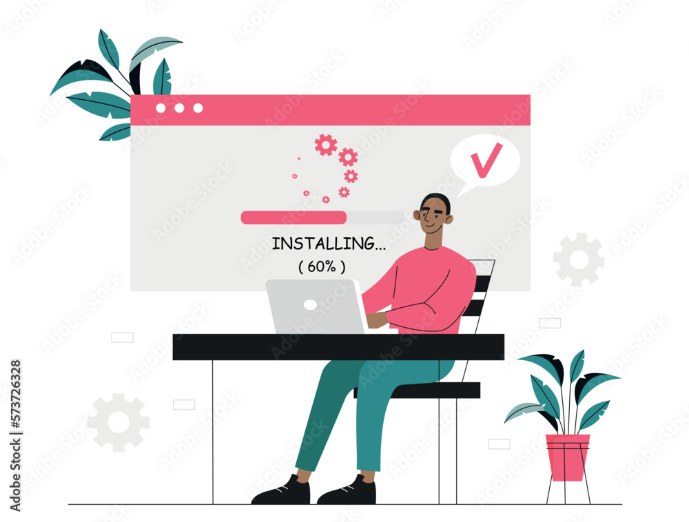The watermark will not be included on Wall mural.: Software installation concept - man behind laptop downloads programs and applications, updates operat