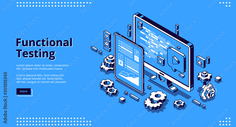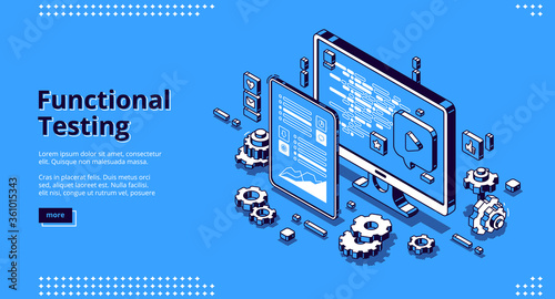 Wall mural : Software testing isometric landing page - functional test, mobile application and website platform de