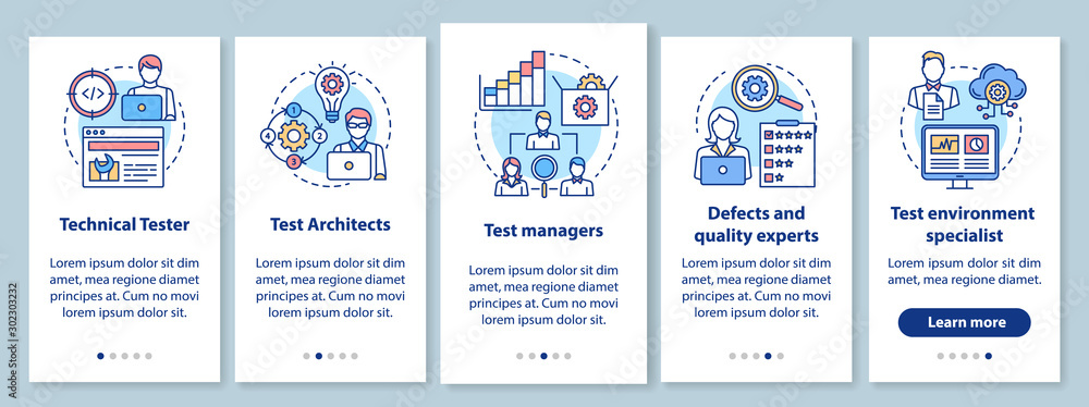Wall mural : Software testing roles onboarding mobile app page screen with linear concepts - qulity control expert