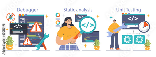 Wall mural : Software testing set - code testing and debugging - it specialist searching for bugs using functional