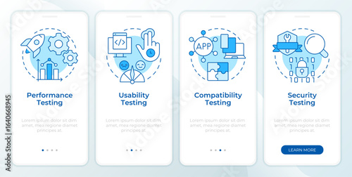 Software usability testing blue onboarding mobile app screen - walkthrough 4 steps editable graphic iWall mural