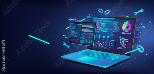 Software with ui design and development for different devices - programming code on 3d laptop and 3d Wall mural