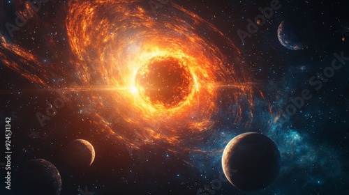 The watermark will not be included on Wall mural.: Solar system with planets and moons orbiting the sun, fantasy space background with swirling cosmic