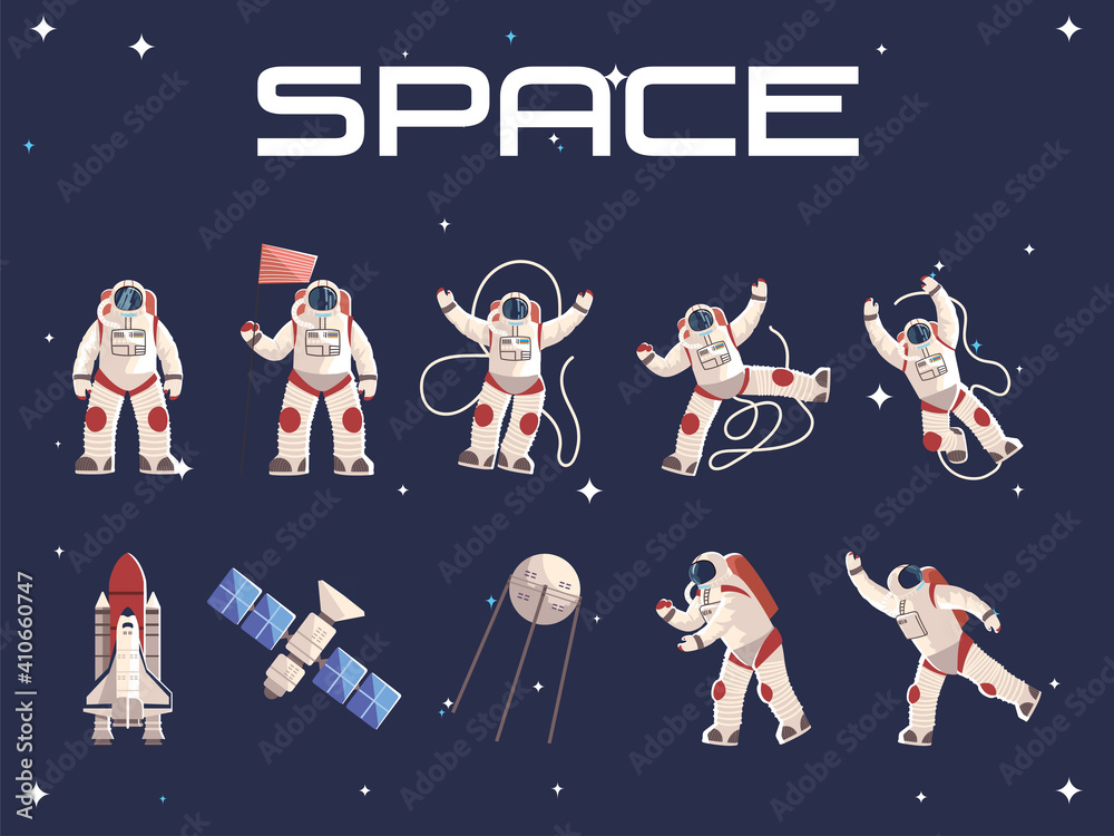 Wall mural space astronaut character in spacesuit satellite spaceship - Wall murals Wall mural space astronaut character in spacesuit satellite spaceship - Wall murals