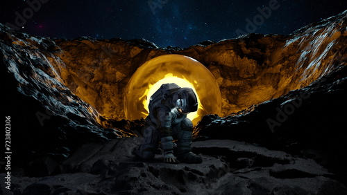 Wall mural : Space astronaut explores distant planet - cosmonaut in a spacesuit touches the ground of an asteroid -