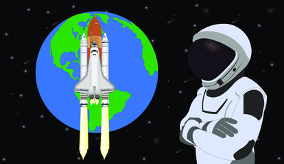 Wall mural space astronaut near shuttle with rocket boosters close to the mars planet of solar system. round ve