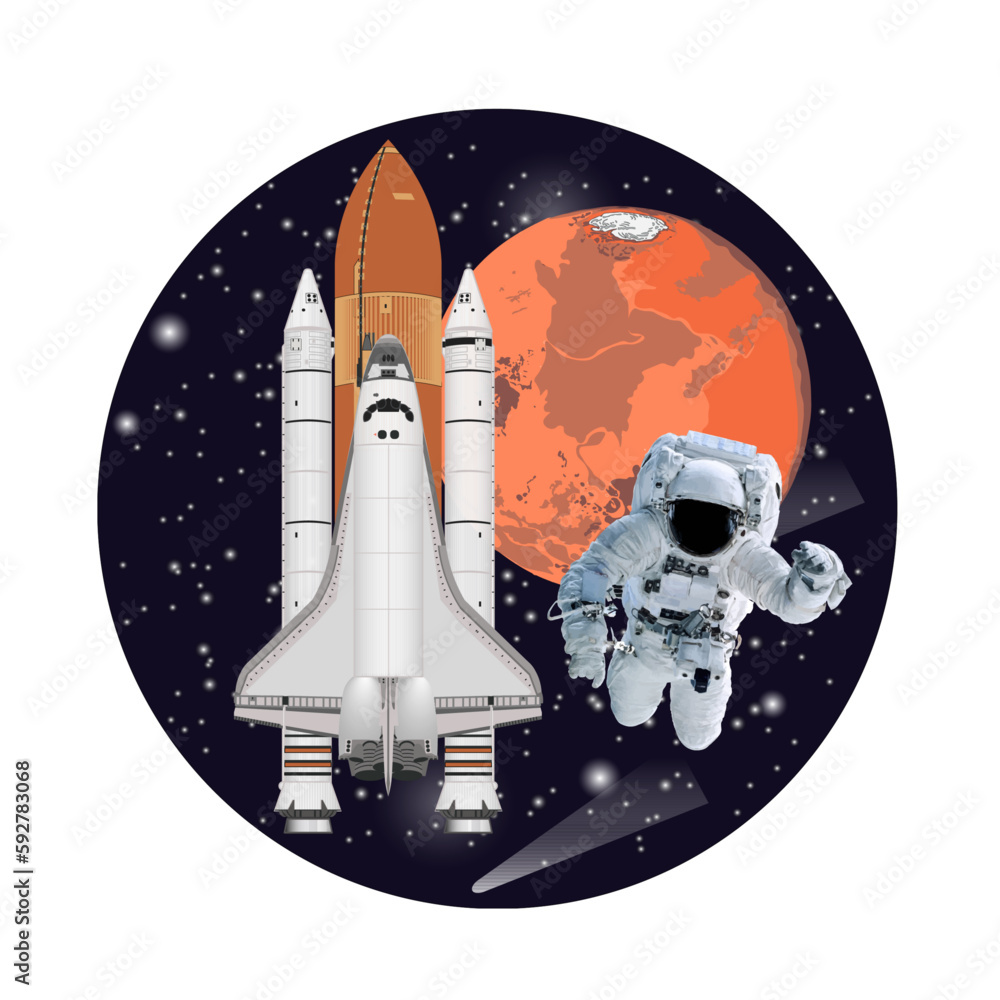 Wall mural space astronaut near shuttle with rocket boosters close to the mars planet of solar system. round ve - Wall murals Wall mural space astronaut near shuttle with rocket boosters close to the mars planet of solar system. round ve - Wall murals