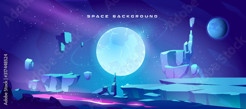 Wall mural space background with landscape of alien planet with craters and lighted crack. vector cartoon fanta
