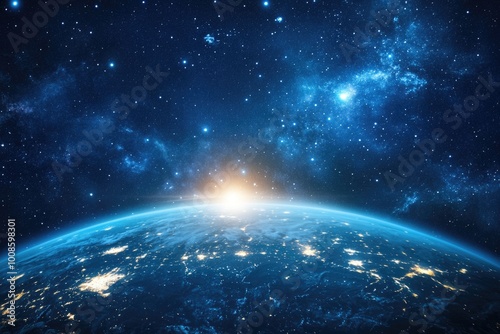 Wall mural : Space background with the blue earth planet illuminated by the night sky -